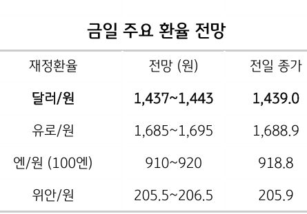 금일 달러/원 환율은 주말간 엔화 약세와 역외 거래 감안해 1,440원 부근 개장 예상.