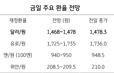 금일 달러/원환율은 정부의 연이은 환율안정조치 및 노력에도 불구하고 역내 및 역외 시장에서 좀처럼 방향성을 잡지 못하고 있어 전일과 유사한 1,470원대에서 좁은 박스권 등락이 예상됨.